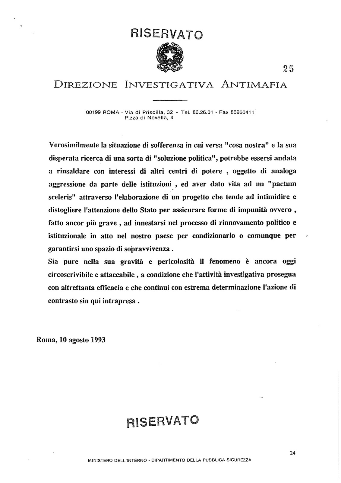 Quelle morti furono volute per non far venire alla luce i legami tra mafia e politica, tra i veri poteri forti e le organizzazioni malavitose. Noi pubblichiamo un documento della D.I.A. (Direzione Investigativa Antimafia) in cui la DIA stessa sottolineava l'assoluta importanza del mantenimento del 41 bis, l'articolo che condanna al carcere duro e in isolamento per i mafiosi, come freno alla mafia e come incentivo al pentimento dei mafiosi già condannati.